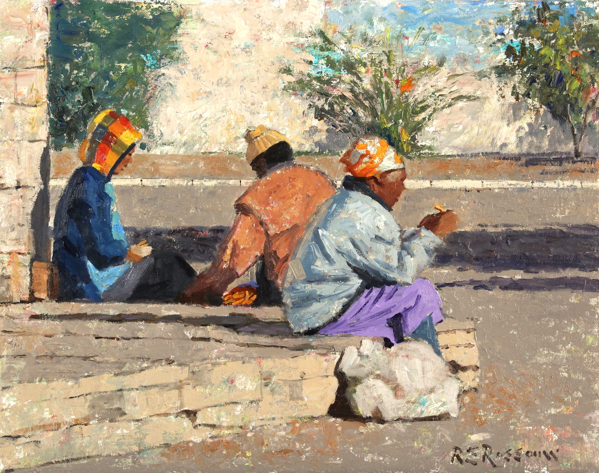 40 x 50 cm – Acrylic and oil on canvas on board. Homeless folk in a small Karoo town enjoying the winter sun and sharing something to eat on a street corner